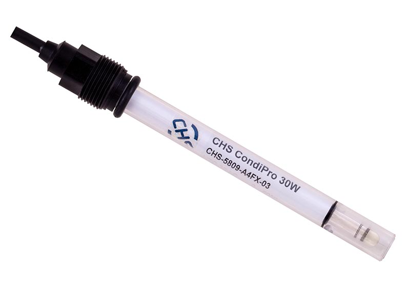 CHS CondiPro 30W je procesní vodivostní sonda s plastovým tělem zajišťujícím ochranu před jejím rozbitím. Konstanta cely K=1 nabízí měřící rozsah od 10µS/cm do 20mS/cm. Konstanta cely je uvedena na kabelu sondy.