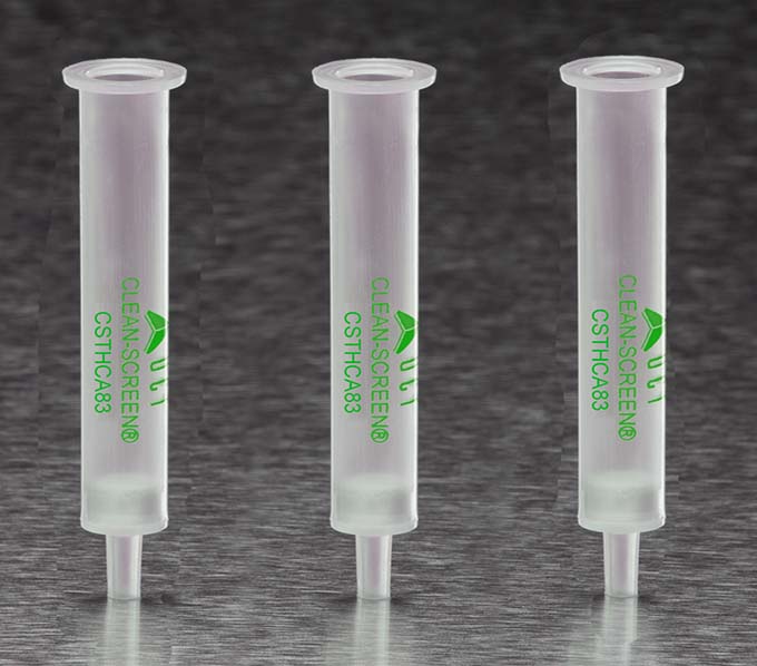 SPE kolonky CLEAN SCREEN® THC mají sorbent kopolymerován na pevném, čistém silikagelovém nosiči. Obsahují dvě funkční skupiny – reverzní fázi a primární aminový iontový měnič. Tento sorbent je užitečný pro analýzu THC a jeho metabolitů a také pro kyseliny a hydrofobní sloučeniny.