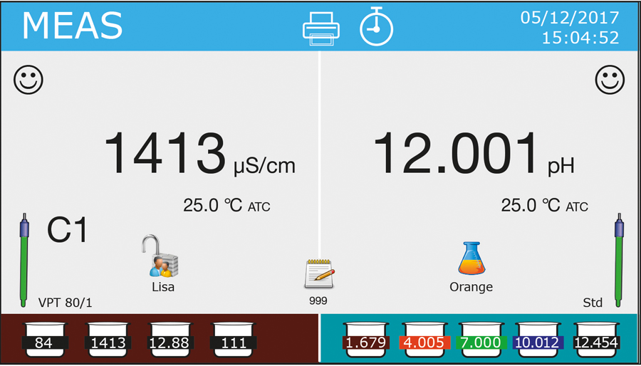 Je vybaven velkým barevným a kontrastním grafickým displejem, který uživatele intuitivně navádí při měření, jeho kalibraci a nastavení. Displej současně zobrazuje kromě měřených veličin i hodnoty pufrů, na které byla prováděna kalibrace, stav elektrody a GLP funkce. Multimetr podporuje 6 jazyků, automatické rozpoznání pufrů a vodivostních standardů a je vybaven magnetickým míchadlem včetně držáku elektrod.