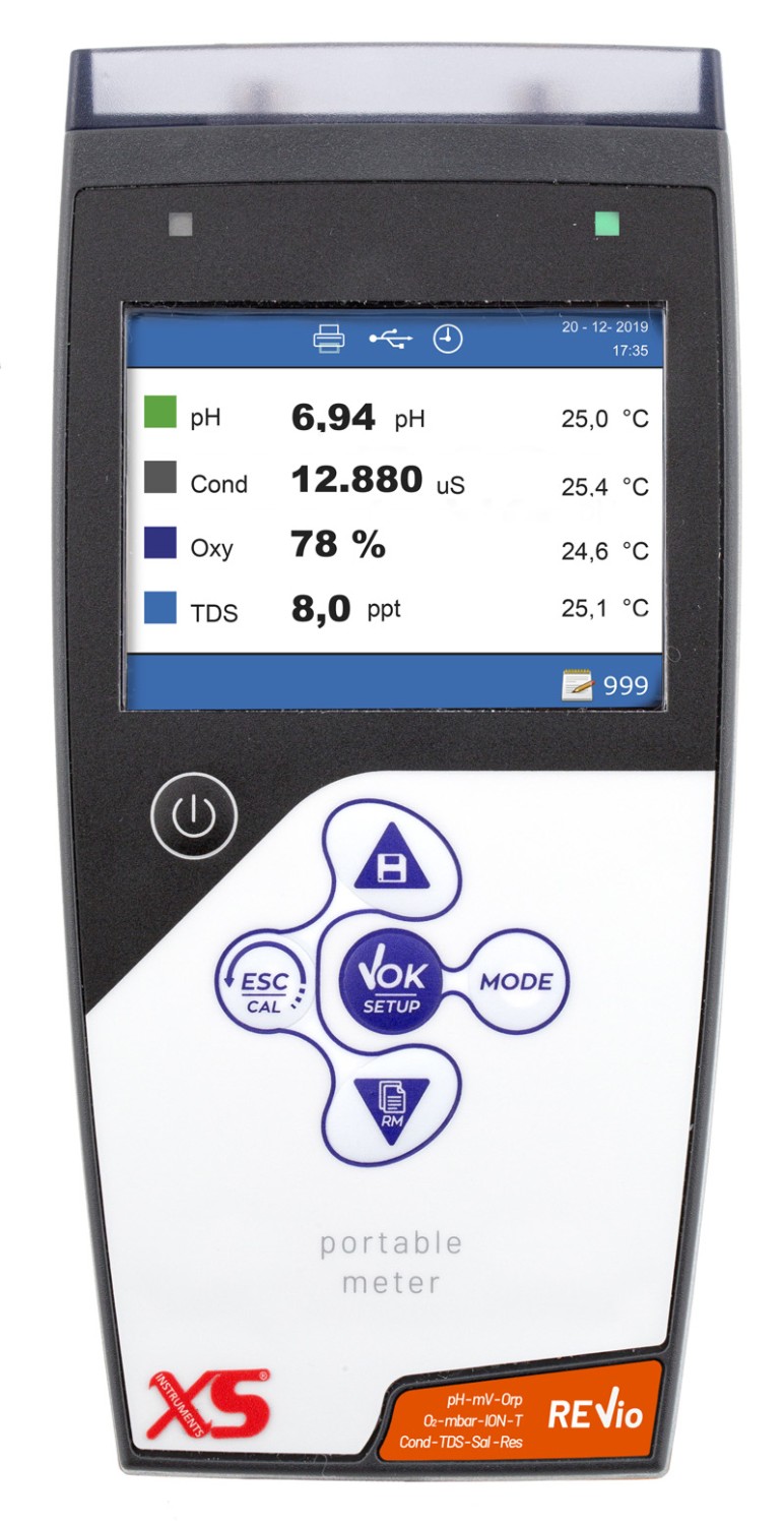 Vodotěsný přenosný multimetr REVIO má velký multifunkční barevný displej zobrazující aktuální naměřenou hodnotu pH/ORP/ISE/vodivosti/TDS/salinity/DO a teploty nebo všechny parametry najednou. Zároveň na displeji zobrazuje čas, indikátor stability, ukládání dat do paměti, informace o kalibraci. Vnitřní zálohovaná paměť přístroje umožňuje uložení 10000 souborů dat (zůstávají uloženy i při vypnutí přístroje). Každá série naměřených údajů je uložena s odpovídající teplotou, časem a datem měření (GLP). Data lze stáhnout do počítače přes USB rozhraní a software Data-Link.