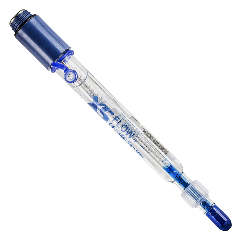 Skleněná kombinovaná pH elektroda FLOW bez teplotního čidla s doplnitelným elektrolytem.