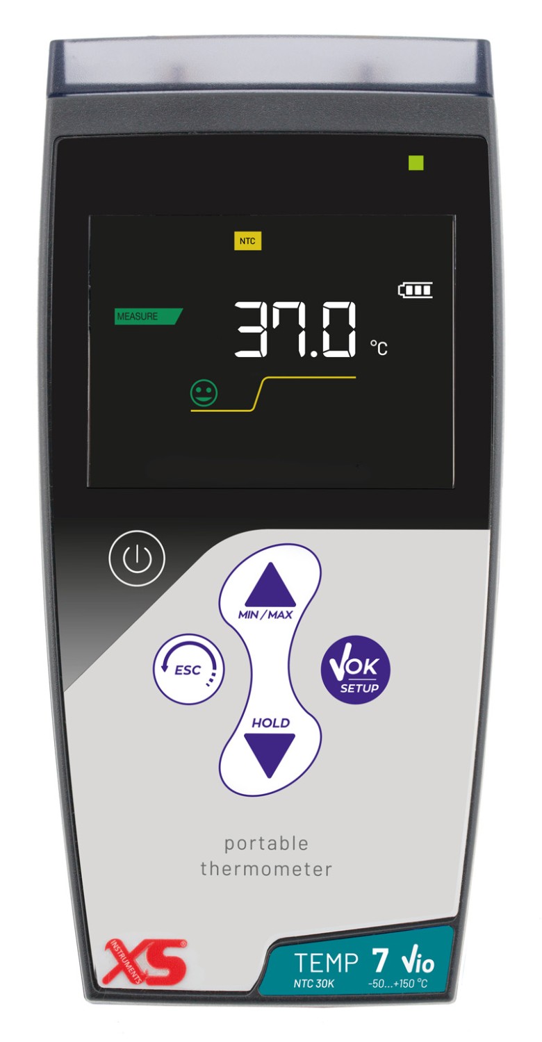 Teploměr Temp 7 NTC řady XS je mikroprocesorově řízený teploměr (mikroprocesor ASIC), který nabízí celou řadu inovativních funkcí při zachování jednoduchého ovládání. Teploměr používá sondu NTC 30K s rozsahem měřeni −50 až +150 °C.