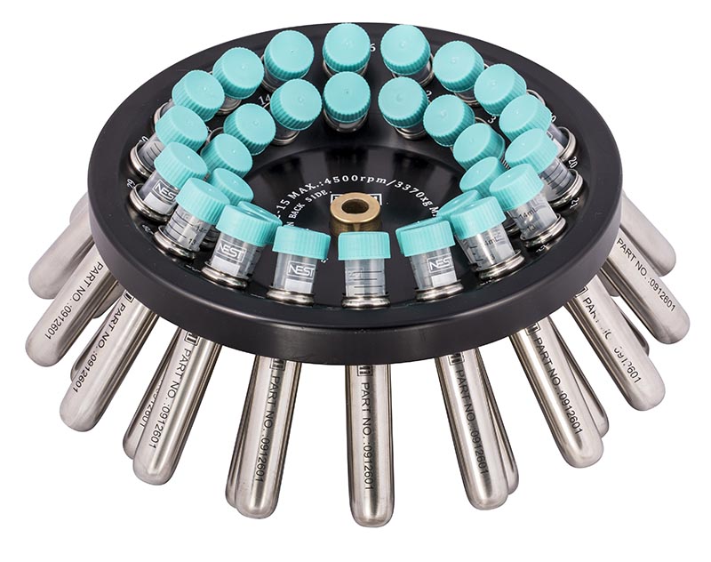 Úhlový rotor 37° je určený pro 32 zkumavek objemu 15 ml. (maximální množství vzorku je uvedeno na rotoru).