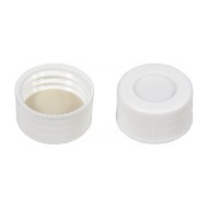 Víčka plastová (polypropylen), bílá barva, závit 24–400, s otvorem a septy PTFE/silikon. Určeno pro EPA vialky, 100ks