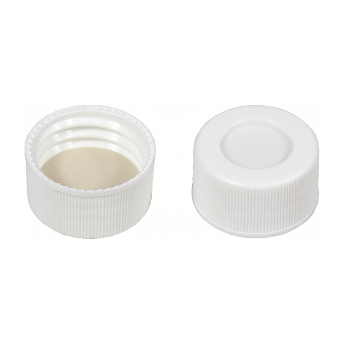 Víčka plastová (polypropylen), bílá barva, závit 24–400, s otvorem a septy PTFE/silikon.