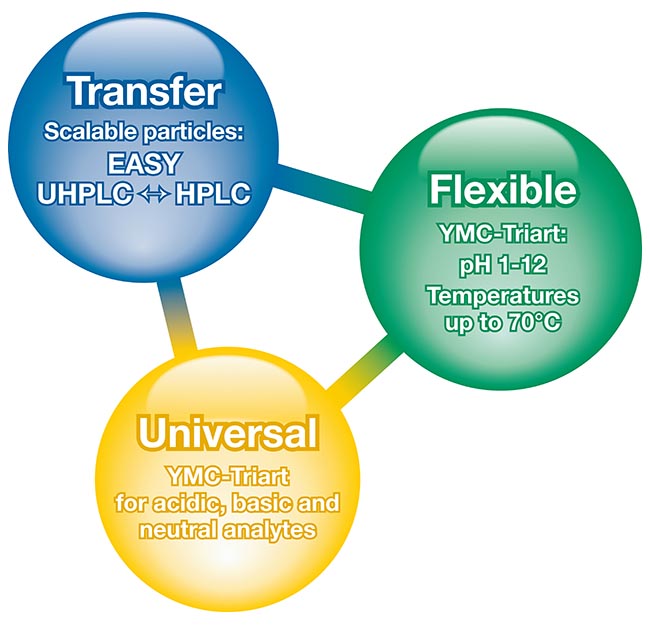 HPLC a UHPLC kolony TRIART TRIple ARTistic technologies Transfer snadný přenos metod mezi UHPLC a HPLC technikou, návaznost na procesní chromatografii kolona pracuje v širokém rozpětí pH (1–12) a teploty, je stabilní až do 70 °C.