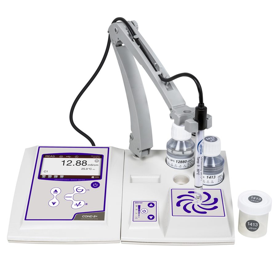 Laboratory conductometer COND 8 Pro is equipped with a large colour and contrast graphical display that user intuitively directs during the measurement and calibration. Additionally the display shows measured values and the values of buffers, which were used for calibration, electrode status and GLP functions.