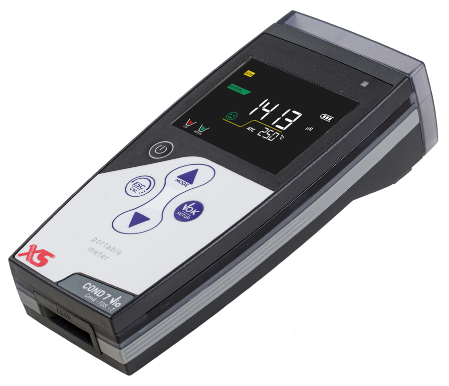 Vodotesný prenosný konduktometer COND 7 Vio má veľký LCD displej zobrazujúci naraz aktuálnu nameranú hodnotu vodivosti a teploty. Dovolí používateľovi nastaviť nasledujúce parametre: výber normalizovanej teploty (medzi 10 až 30°C, továrenské nastavenie 25°C), nastavenie teplotného koeficientu (od 0 do 10,00% na °C), jedno- či viacbodovú kalibráciu, voľbu konštanty cely (k = 0,1, 1,0 nebo 10,0) a resetovanie na prednastavené továrenské hodnoty.